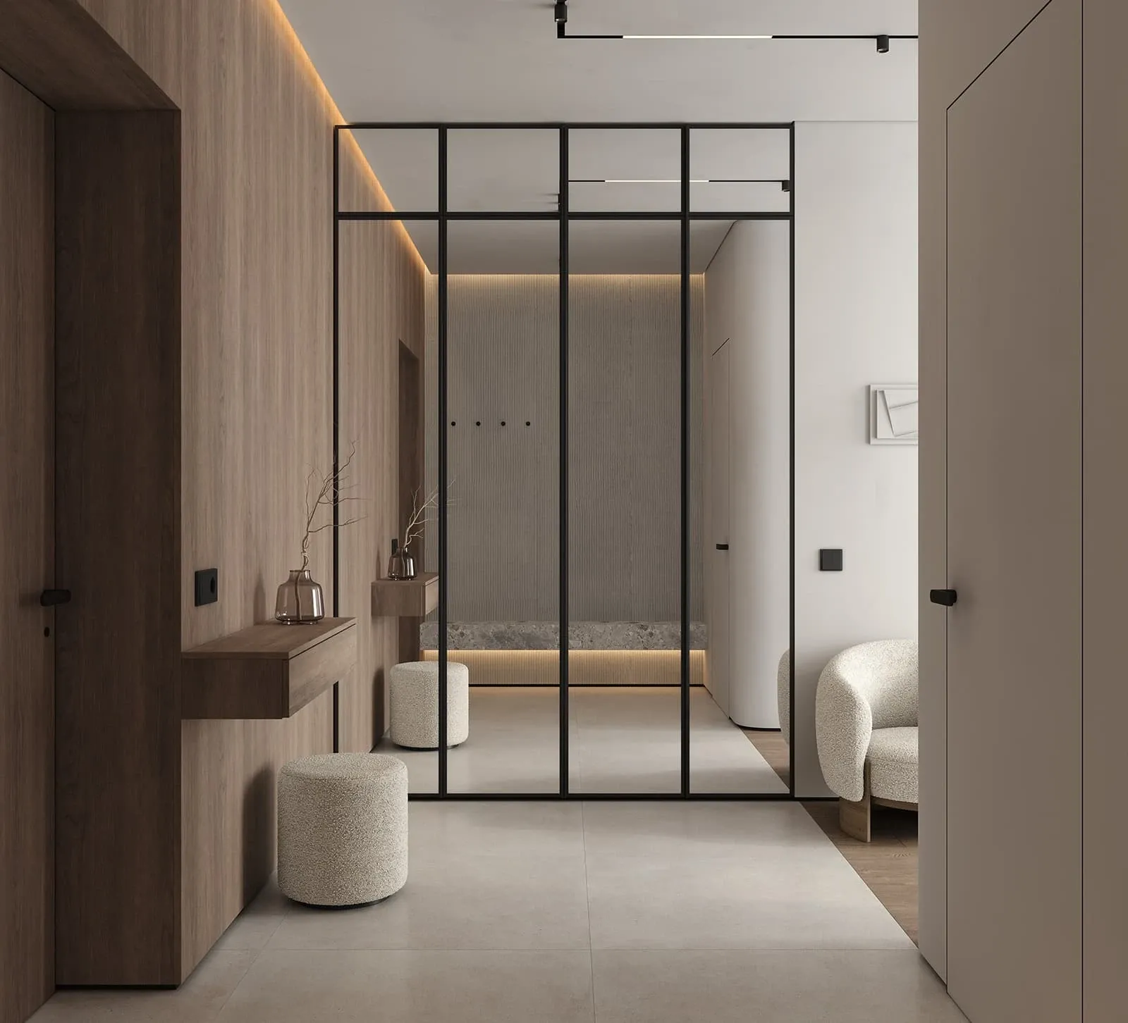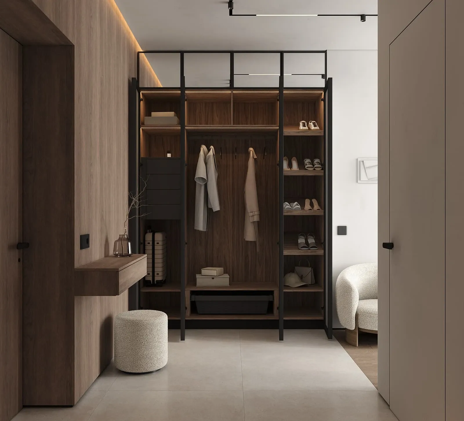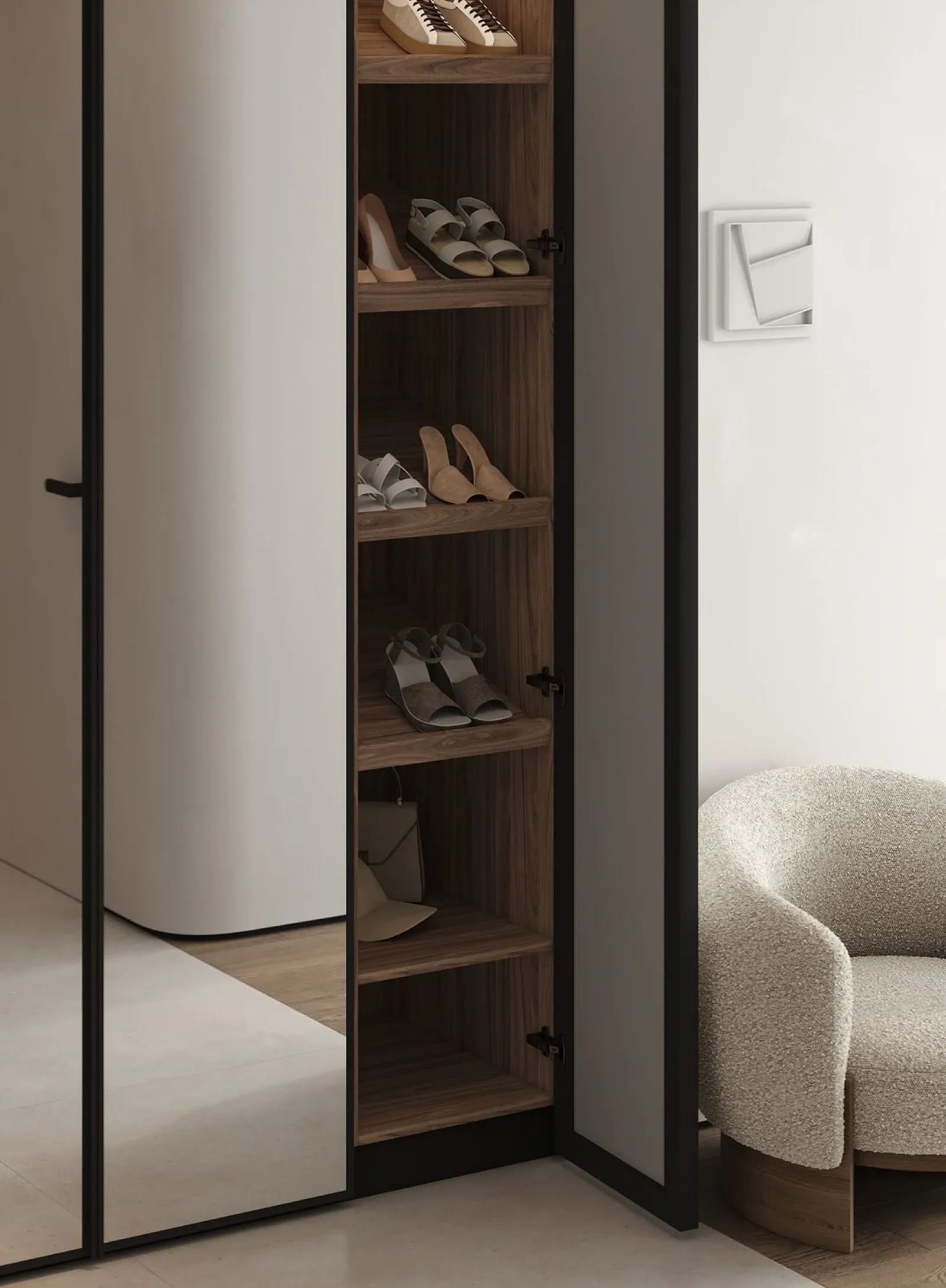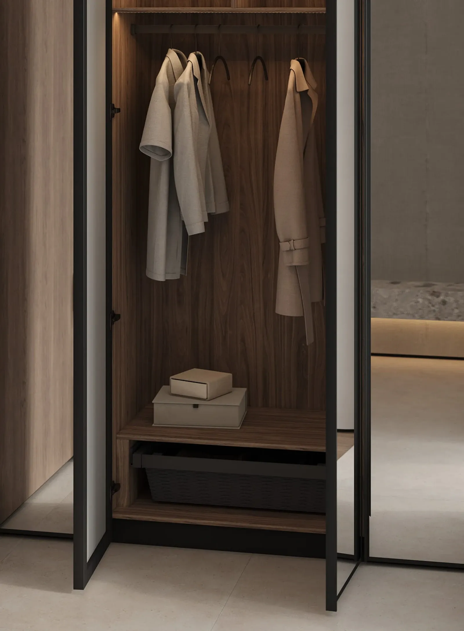 КАРКАС, ПОЛКИ, ВНУТРЕННИЕ ВЫДВИЖНЫЕ ЯЩИКИ, ЗАДНЯЯ СТЕНКА ЛДСП, декор Орех Карини Натуральный / Графит ФАСАДЫ Алюминиевый профиль А - 2 Терра Черная (ручка - профиль С - 5, угол запила 90˚), зеркало