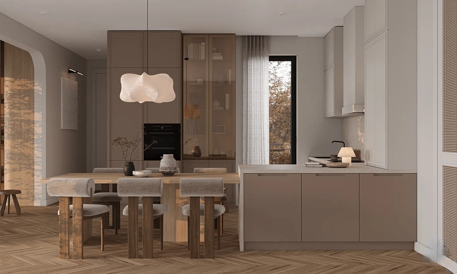 Фасады кухни, окрашенные в изысканные оттенки, придают ей особую привлекательность и создают атмосферу уюта и гармонии. Интегрированные ручки, практично встроенные в поверхности фасадов, придают кухонному интерьеру стильную и изысканную нотку. Это не только функциональное, но и эстетически привлекательное решение, которое делает кухню более элегантной и современной.