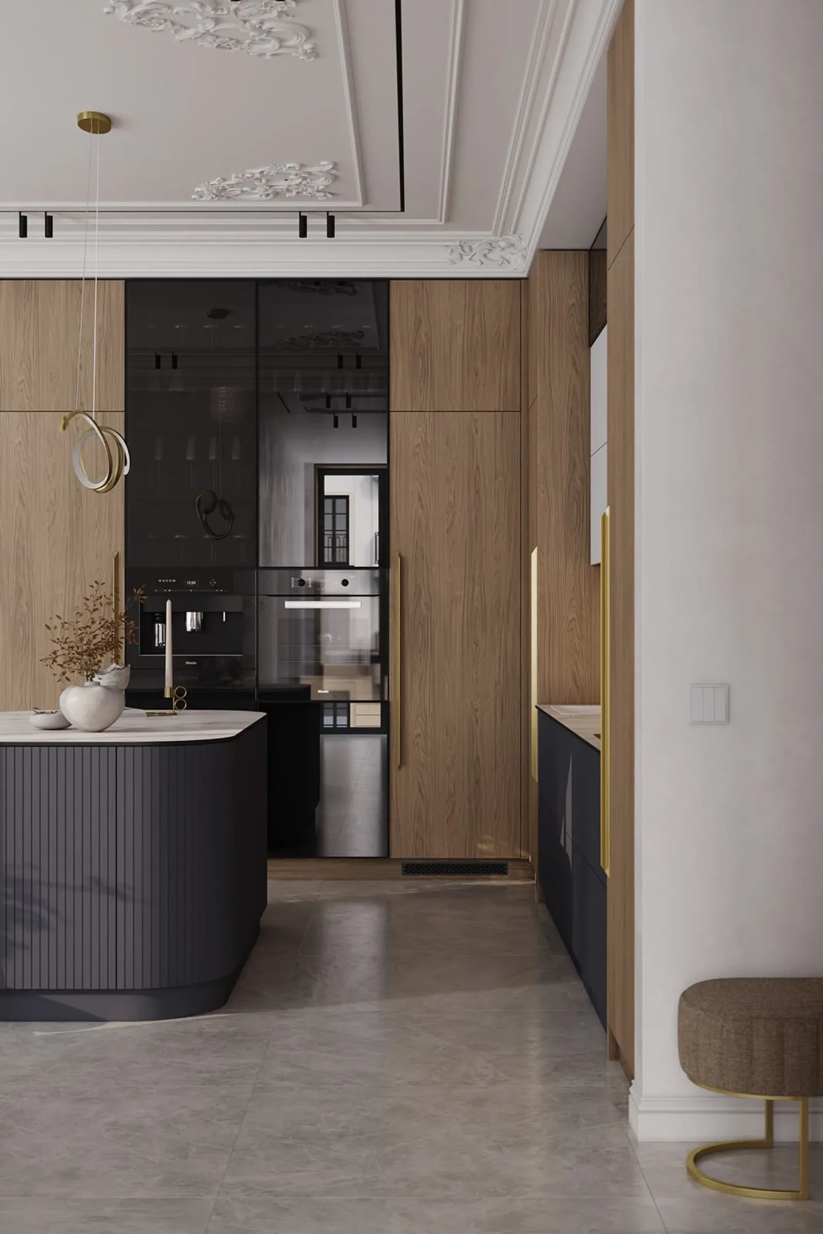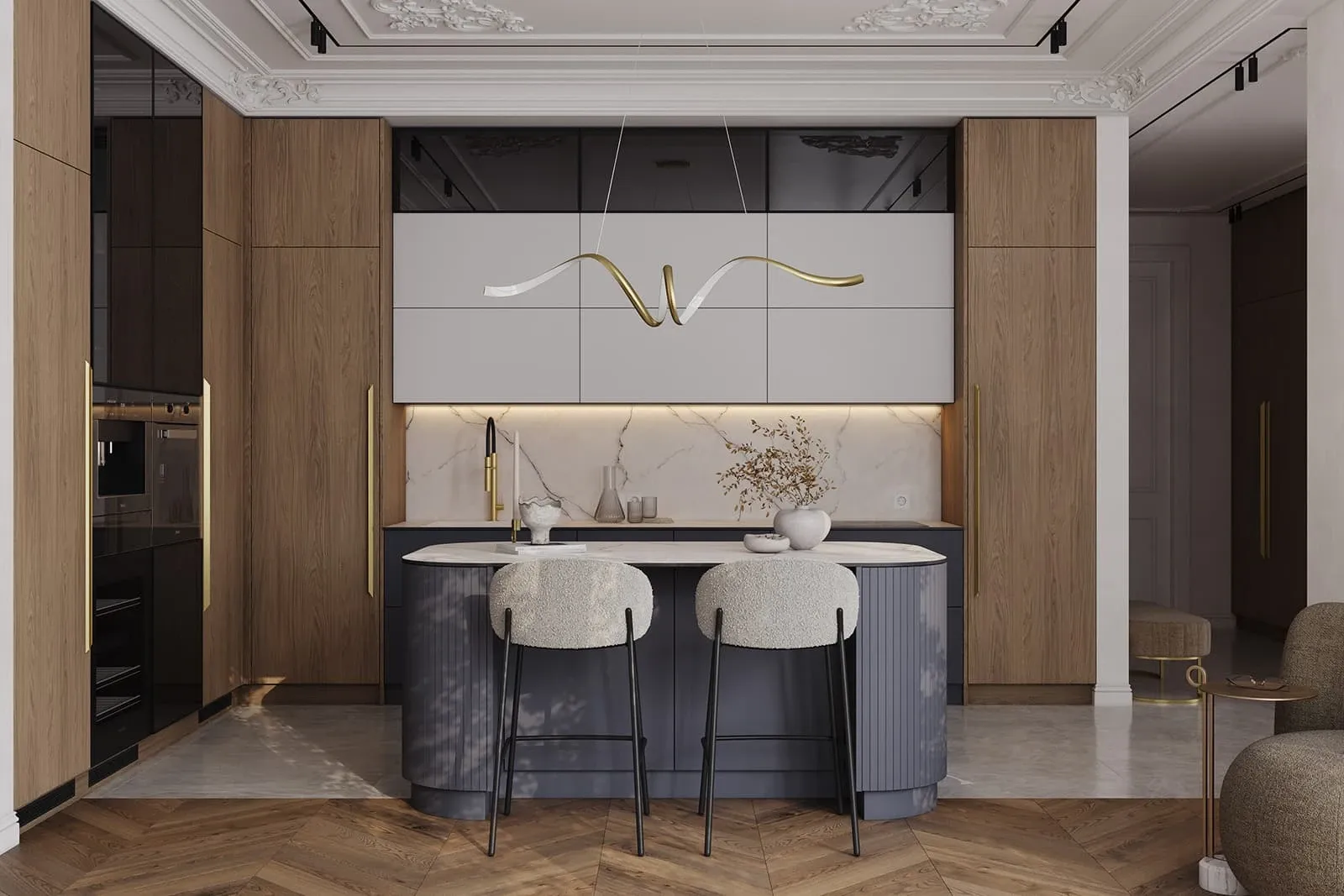 Фасады: ЛМДФ Тимбер, декор Каселла Коричневый / Аврора (крашеная МДФ), цвет NCS S 6010-R90B Матовый / крашеная МДФ, цвет NCS S 6010-R90B Матовый / NCS S 2000-N Матовый
