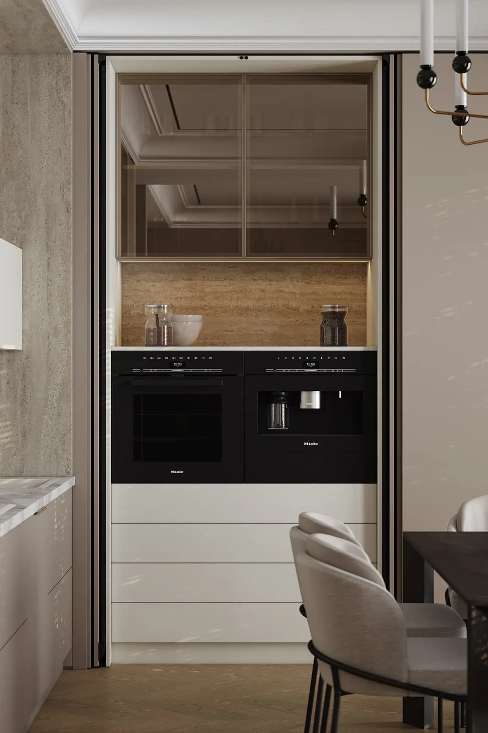 Витрины: Алюминиевый профиль А-6 Латунь (скрытая петля AIR PUSH), стекло Феникс Бронза