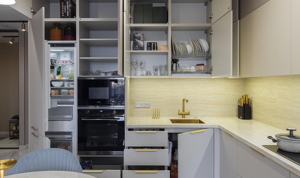Техника: мойка и смеситель - EMAR, измельчитель - BONE CRUSHER, встроенный духовой шкаф, встроенная электрическая варочная панель, встроенная СВЧ, встроенная вытяжка, встроенная ПММ, встроенный холодильник - KORTING
