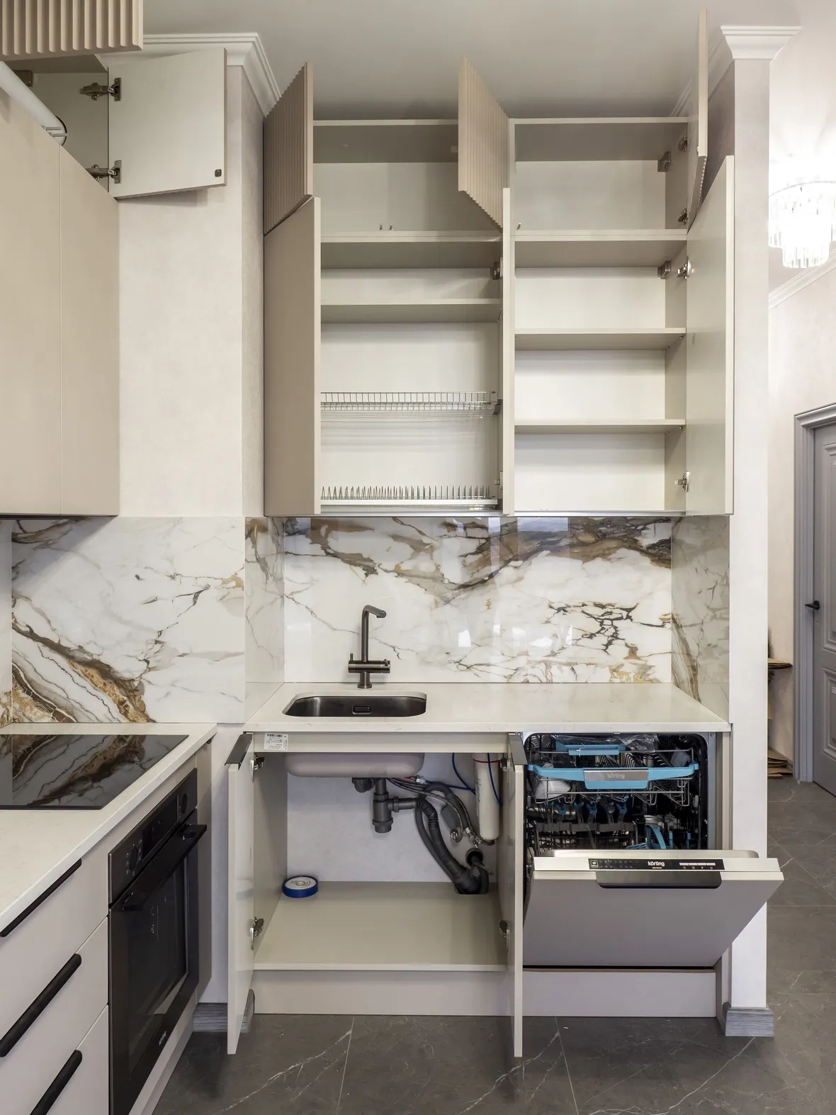 Техника: мойка и смеситель - EMAR, измельчитель - BONE CRUSHER, встроенный духовой шкаф, встроенная электрическая варочная панель, встроенная СВЧ, встроенная вытяжка, встроенная ПММ, встроенный холодильник - KORTING